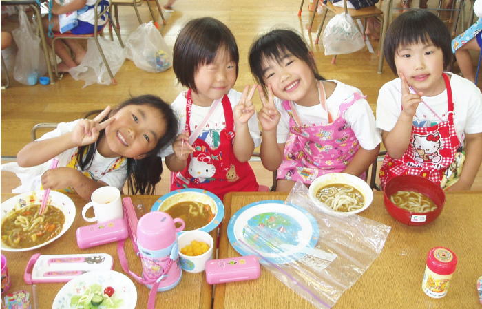 月に一度のクッキングは、みんなとっても大好き!リスやパンダクラスのおともだちは包丁だって上手に使うことができるよ。 エプロン姿も似合うでしょ!これで、お家でもお手伝いができるね!
