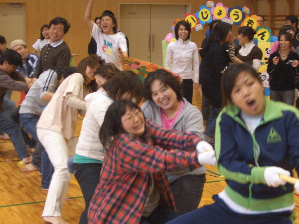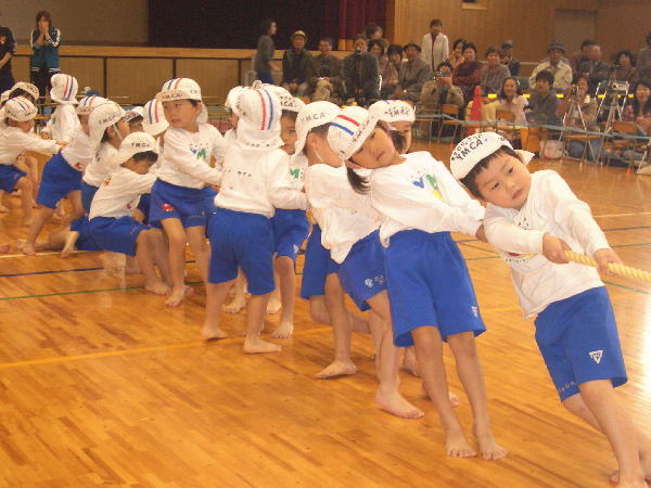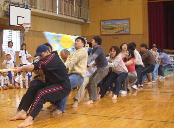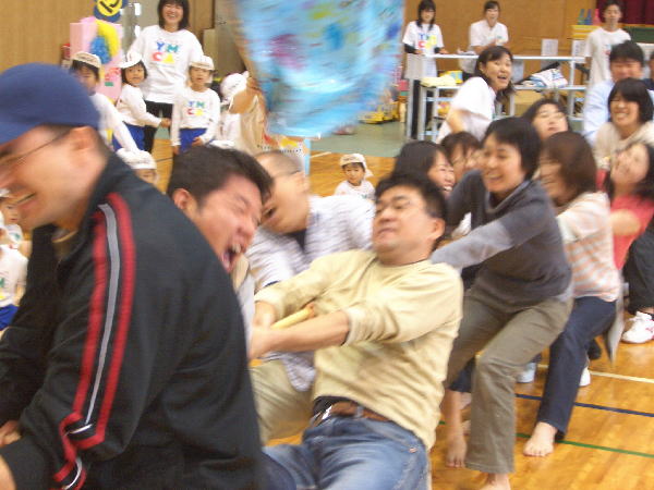 全員参加で大興奮!“つなひき”です。特にパパママチームは綱が切れてしまうんじゃないかと心配しました。